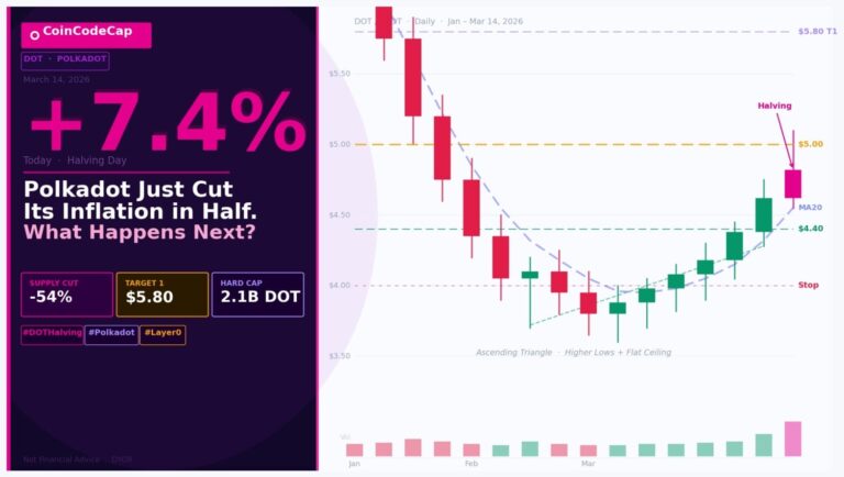 DOT has spent the past six weeks forming a series of higher lows against a persistent resistance band around $5.00-$5.20. That pattern – rising floor, flat ceiling – resolves in one direction eventually. The halving is the catalyst most traders have been waiting for to call the direction.