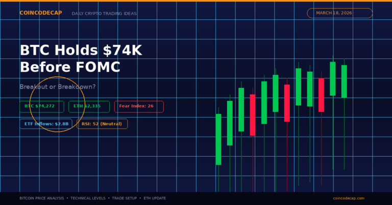 The Bitcoin price opened the March 18 session near $74,272, stuck inside a razor-thin band that has capped every move for three straight days. Crypto traders worldwide are watching a single event: the Federal Reserve’s FOMC meeting scheduled for March 19. Whatever Jerome Powell says about rising oil prices and sticky inflation tomorrow will almost certainly decide whether BTC breaks out or breaks down from this consolidation. For anyone holding Bitcoin, Ethereum, or altcoins, the next 36 hours are the most important of the month.