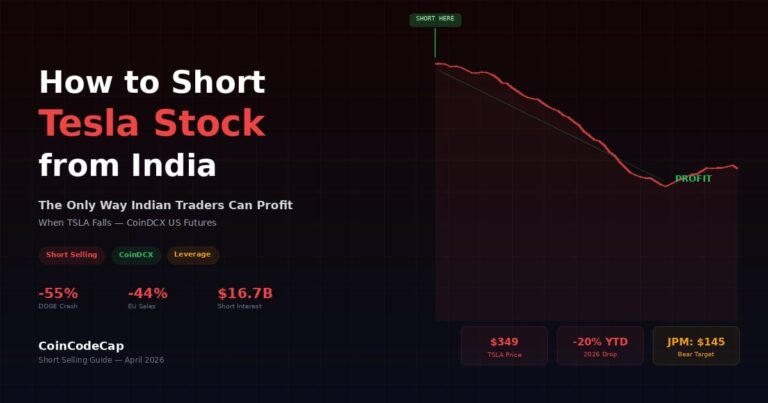 Tesla hit $489 in December 2025. As I write this in April 2026, it’s at $349. That’s a 29% decline in four months that every Indian investor holding TSLA on Vested or INDmoney watched helplessly — because not a single Indian retail platform other than CoinDCX lets you short a US stock.