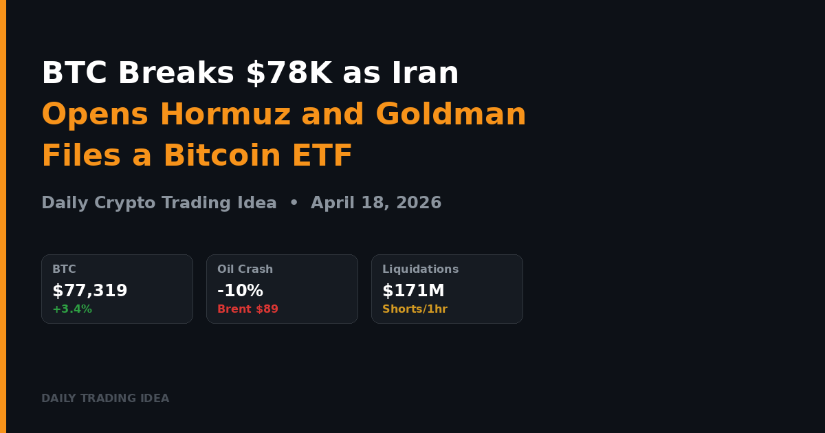 This is one of those days where everything lines up at once. Iran’s foreign minister announced the Strait of Hormuz is fully open. Trump said the deal is “mostly complete” and the remaining issues should be wrapped up this weekend. Oil crashed 10%. The S&P 500 broke to all-time highs. And Bitcoin ripped to $78,343—its highest level since early February.